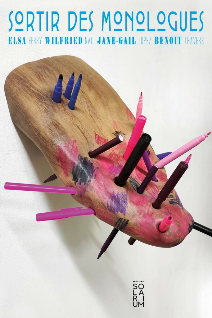 Les textes de Sortir des monologues font partie de performances, de dispositifs activables en exposition et sur scène. Le livre est écrit à 8 mains et joué à 4 voix. Les auteur.e.s sont artistes visuels, musiciens et metteuse en scène.